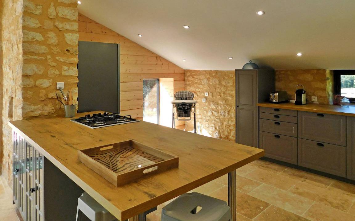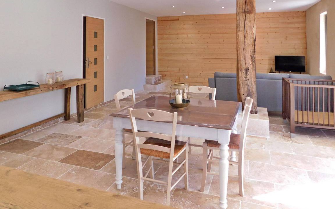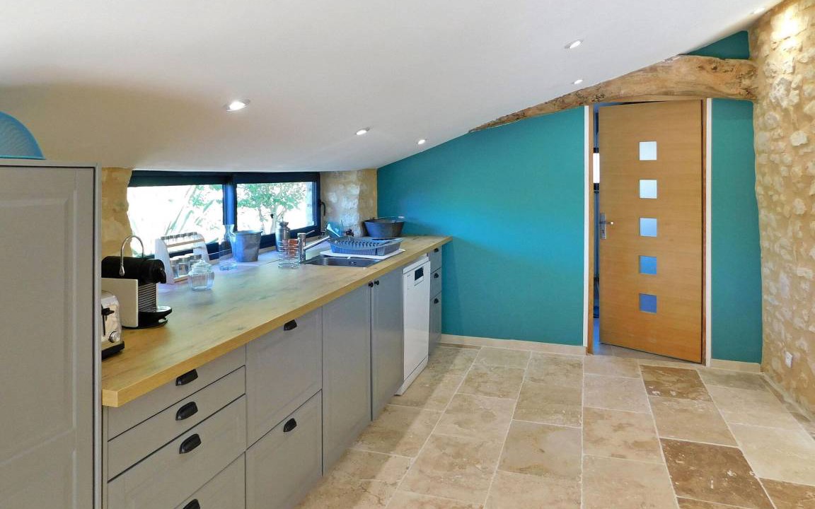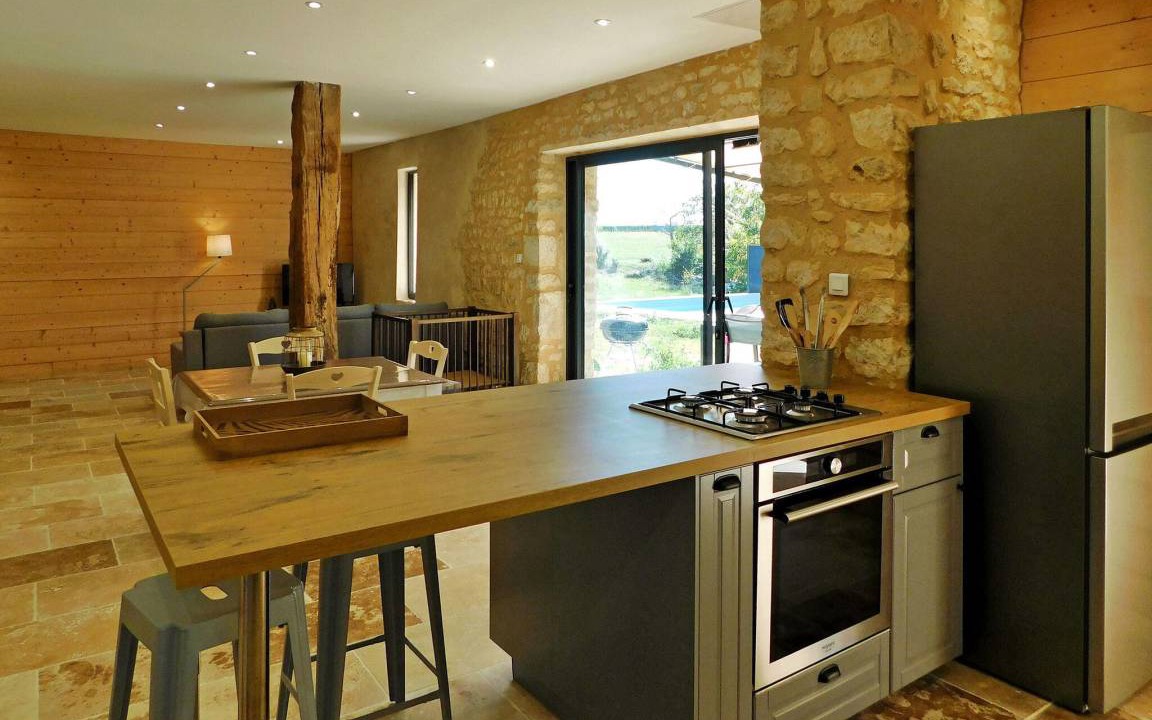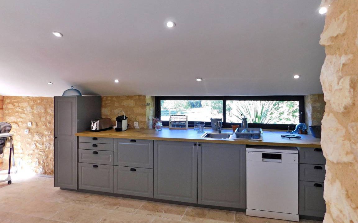 The holiday rental, nestled in a serene hamlet approximately 2 km from Cunèges village, offers a comfortable living space with air-conditioning. The property includes an amply spaced kitchen equipped with essential amenities, a dining area, and a cosy sitting area with comfy chaise longue sofa.