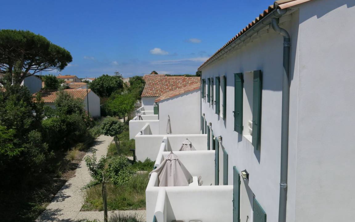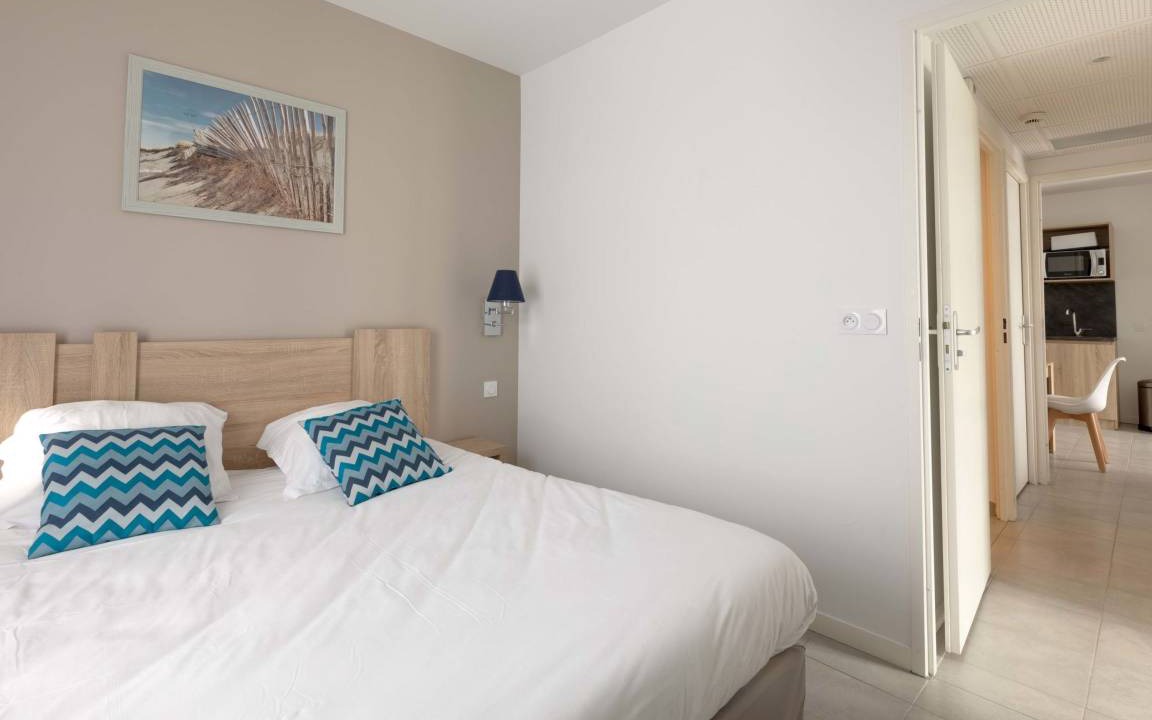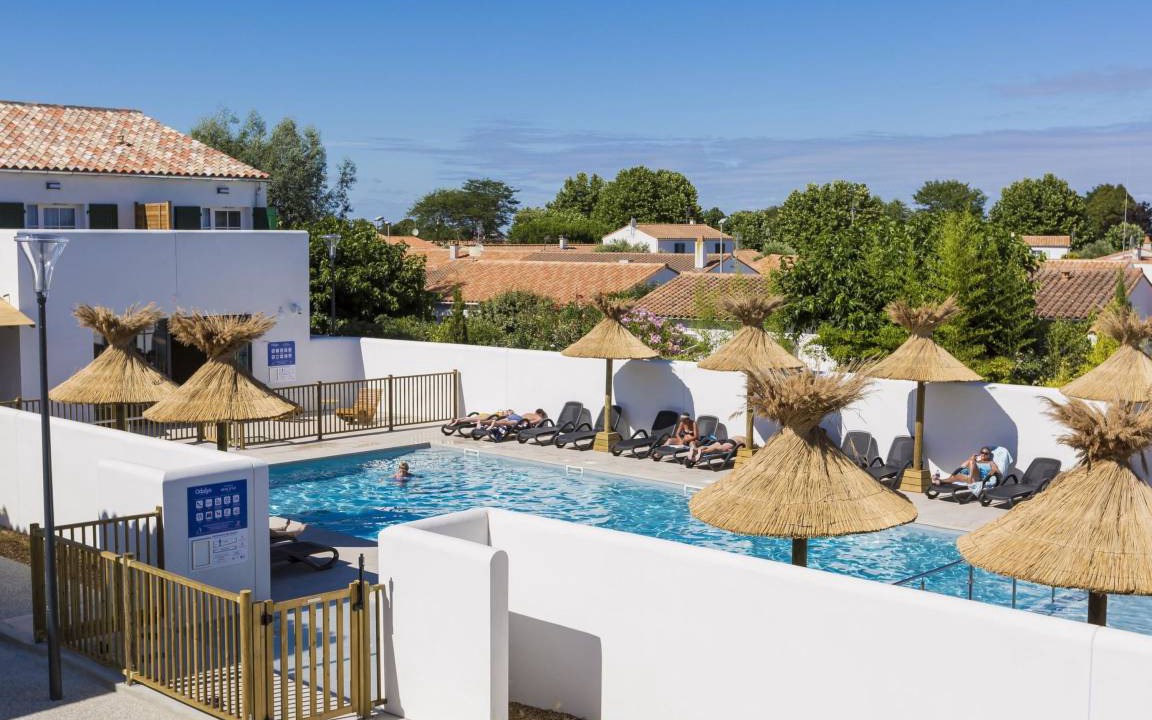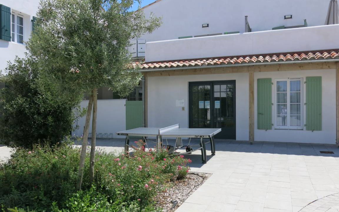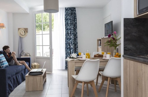 Résidence Odalys Collection Rève dIle, 2-room apartment 39 m² on 2 levels. Bright, practical furnishings: living/sleeping room with 1 bed, 1 pull-out bed, dining table and TV. Exit to the balcony, to the terrace. 1 room with 1 french bed (160 cm, length 190 cm) with 1 x 2 bunk beds (80 cm, length 190 cm). Small, open kitchen (dishwasher, 4 ceramic glass hob hotplates, toaster, kettle, freezer, electric coffee machine, combination microwave). Bath/WC. Heating. Terrace. Terrace furniture. Facilities: childrens high chair, baby cot (extra), hair dryer. Internet (WiFi, free). Please note: non-smokers only. Maximum 2 pets/ dogs allowed. Smoke alarm, fire extinguisher. The property is one of a type of property or apartment. Resort Rêve dIle, built in 2018. 87 apartments in the residence. 150 m from the centre of Rivedoux, 3.5 km from the centre of Sainte-Marie-en-Ré, 14 km from the centre of La Rochelle, 300 m from the sea. For shared use: property 4000 m² with plants and trees, swimming pool heated, fenced (15 x 7 m, depth 160 cm, seasonal availability: 15.Apr. - 15.Sep.). Childrens pool, terrace. In the complex: reception, breakfast room, sauna (extra). Fitness room (extra). Steam room (extra). Table tennis, storage room for bicycles, washing machine, tumble dryer (for shared use, extra), bicycle rental. Breakfast possible (extra). Footpath to the house. Parking on the premises. Shop, restaurant 300 m. Please note: car-free holiday complex. The photograph shows a typical example. The holiday properties may differ in living space, floorplan, equipment and furnishing.