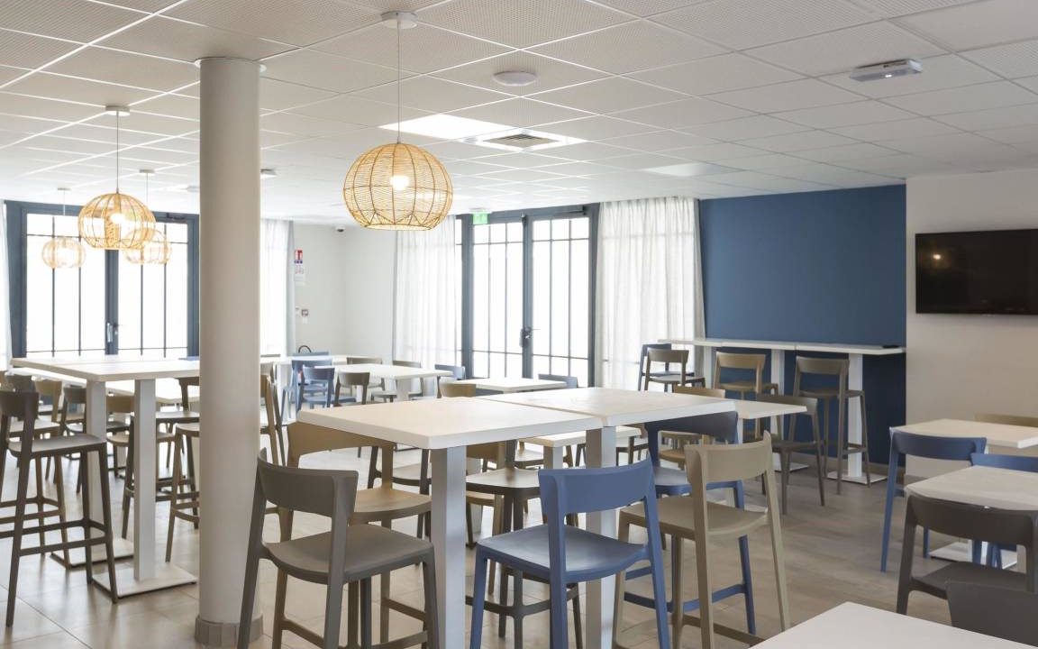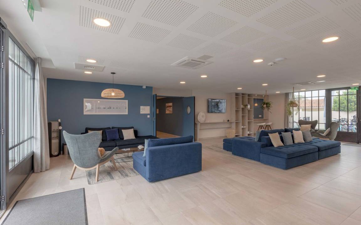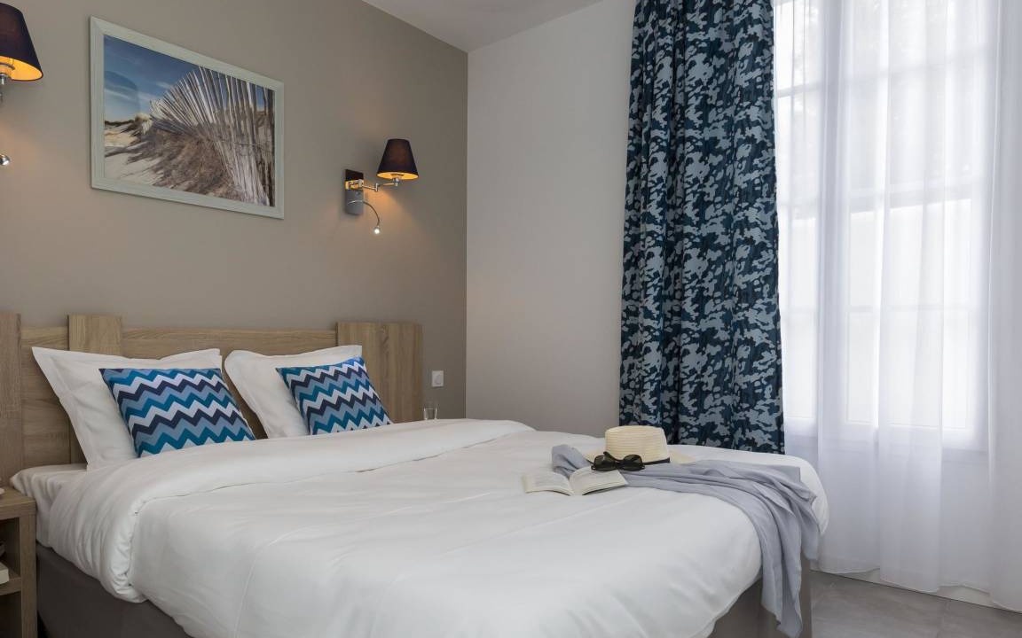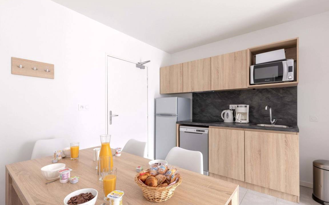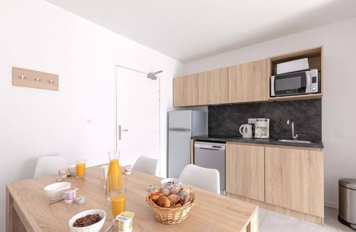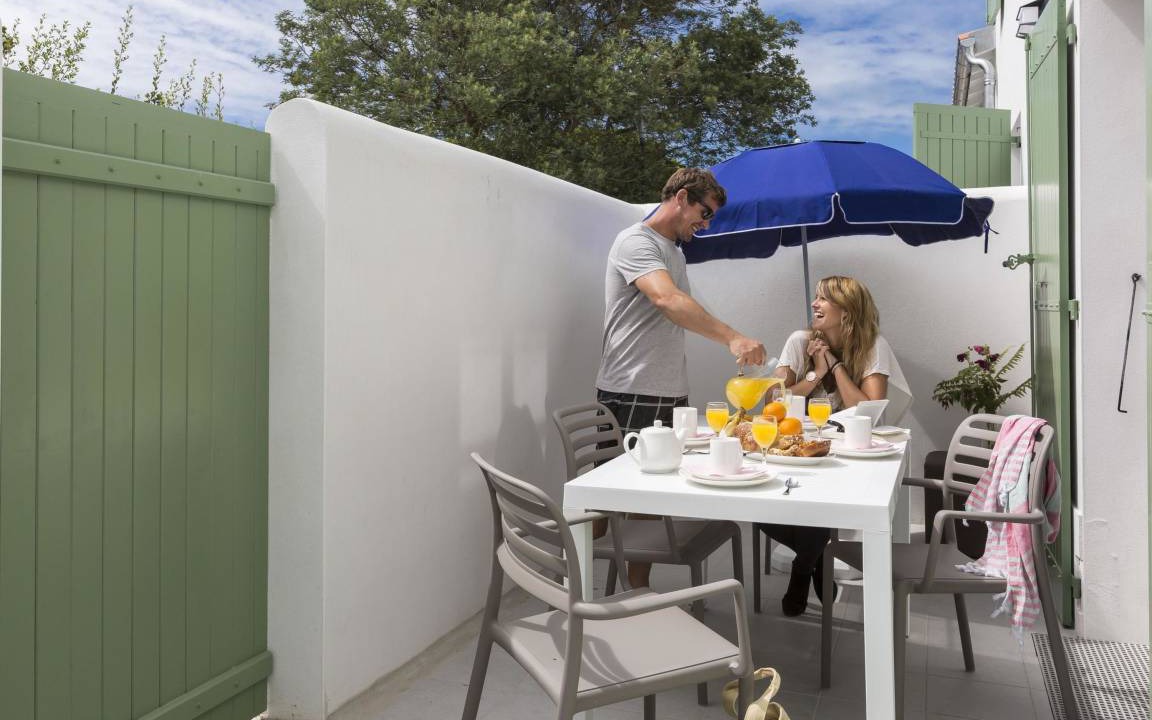 Résidence Odalys Collection Rève dIle, 2-room apartment 39 m² on 2 levels. Bright, practical furnishings: living/sleeping room with 1 bed, 1 pull-out bed, dining table and TV. Exit to the balcony, to the terrace. 1 room with 1 french bed (160 cm, length 190 cm) with 1 x 2 bunk beds (80 cm, length 190 cm). Small, open kitchen (dishwasher, 4 ceramic glass hob hotplates, toaster, kettle, freezer, electric coffee machine, combination microwave). Bath/WC. Heating. Terrace. Terrace furniture. Facilities: childrens high chair, baby cot (extra), hair dryer. Internet (WiFi, free). Please note: non-smokers only. Maximum 2 pets/ dogs allowed. Smoke alarm, fire extinguisher. The property is one of a type of property or apartment. Resort Rêve dIle, built in 2018. 87 apartments in the residence. 150 m from the centre of Rivedoux, 3.5 km from the centre of Sainte-Marie-en-Ré, 14 km from the centre of La Rochelle, 300 m from the sea. For shared use: property 4000 m² with plants and trees, swimming pool heated, fenced (15 x 7 m, depth 160 cm, seasonal availability: 15.Apr. - 15.Sep.). Childrens pool, terrace. In the complex: reception, breakfast room, sauna (extra). Fitness room (extra). Steam room (extra). Table tennis, storage room for bicycles, washing machine, tumble dryer (for shared use, extra), bicycle rental. Breakfast possible (extra). Footpath to the house. Parking on the premises. Shop, restaurant 300 m. Please note: car-free holiday complex. The photograph shows a typical example. The holiday properties may differ in living space, floorplan, equipment and furnishing.