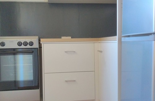 The kitchen is equipped with an oven, a stovetop, and a refrigerator, as well as a coffee maker, an electric kettle, and a microwave. Other amenities include heating and a dining table.