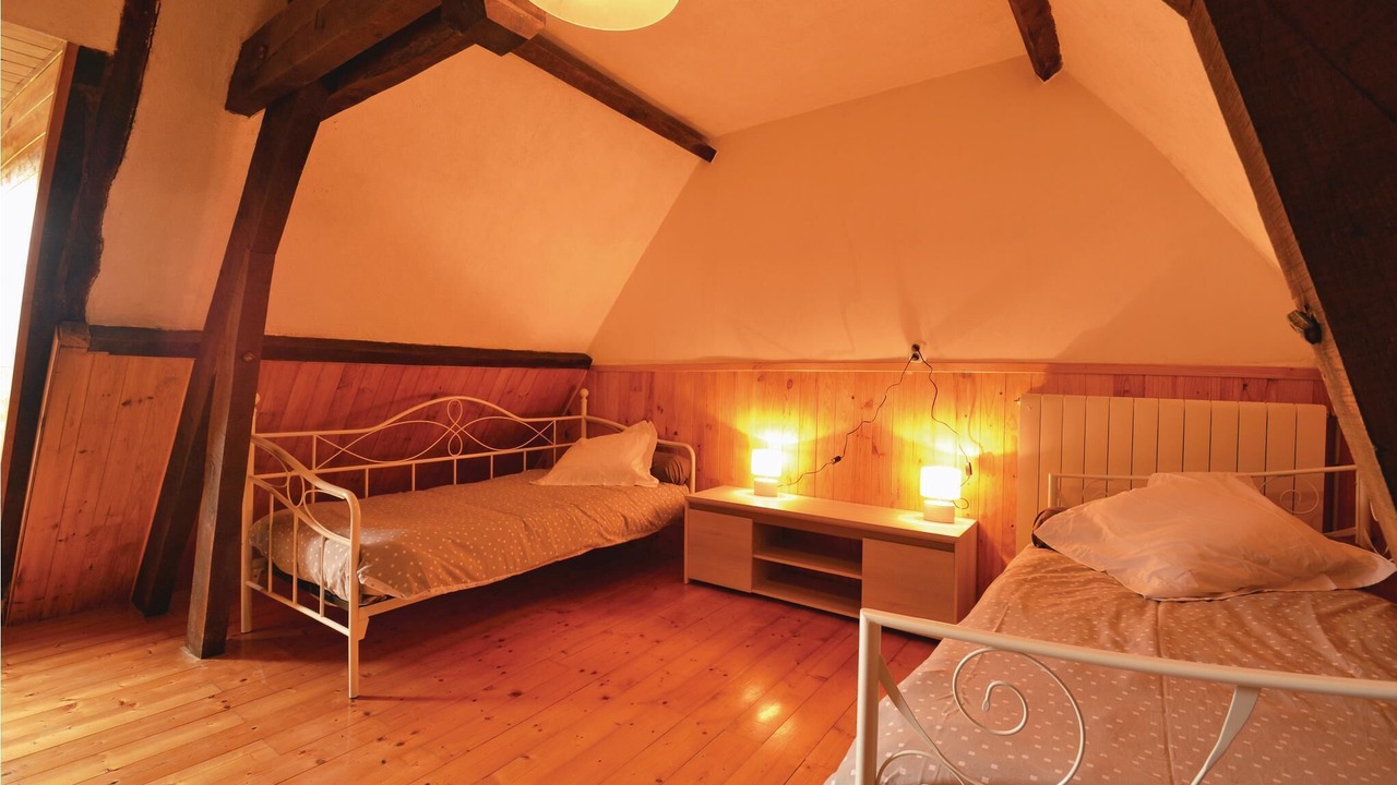 This semi-detached house with shared pool is part of an authentic farmhouse with wooden beams and rustic walls in the small village of La-Chapelle-Saint-Jean.