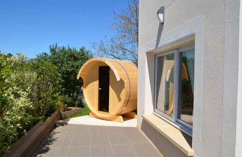 This cozy cocoon opens in effect on a large terrace with garden furniture inviting, extended by the heated indoor pool all year and spa 5 places where you will enjoy the benefits of color therapy and 46 nozzles massage. The park that surrounds it also hosts an original sauna, barrel shaped. This is an entirely private spa complex with private, dedicated to relaxation, in the serenity and conviviality.
