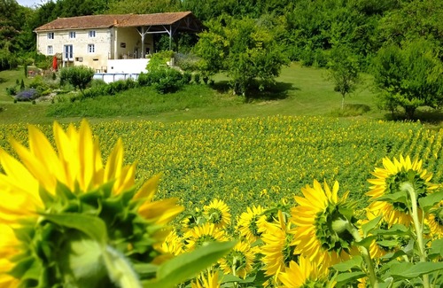 Chez Les Hirondelles is a large and beautifully renovated stone barn standing on a hillside with outstanding views. Our property includes all modern facilities, yet still retains the character features of huge oak beams and Charentais stone walls. There are breathtaking views from every room, and the well established, spacious garden leads in to the surrounding countryside. The fantastic open sided covered hanger offers another patio, meaning you can sit out in the fresh air having a BBQ, come rain or shine looking out far across the sunflower fields, woodlands and hills beyond. For those who enjoy star gazing, the night sky here is amazing with no light pollution at all. The 10 x 5 m pool is totally private to the property and surrounded by a decking patio with plenty of space for sun bathing and a choice of areas for alfresco dining. The pool has an alarm system and is fenced so very safe for children. The barn can sleep up to 12/13 people and is extremely spacious both inside and out and makes for an inexpensive option for a large family or group get together.