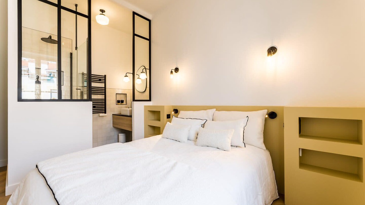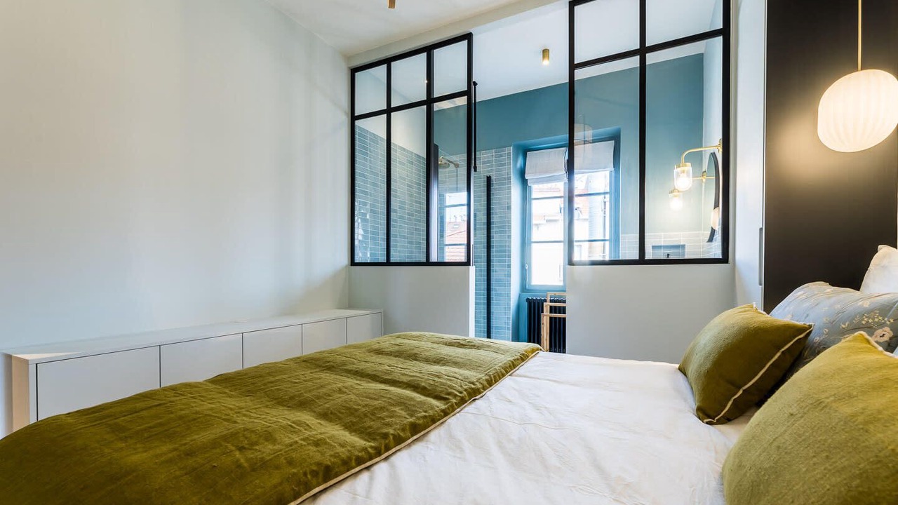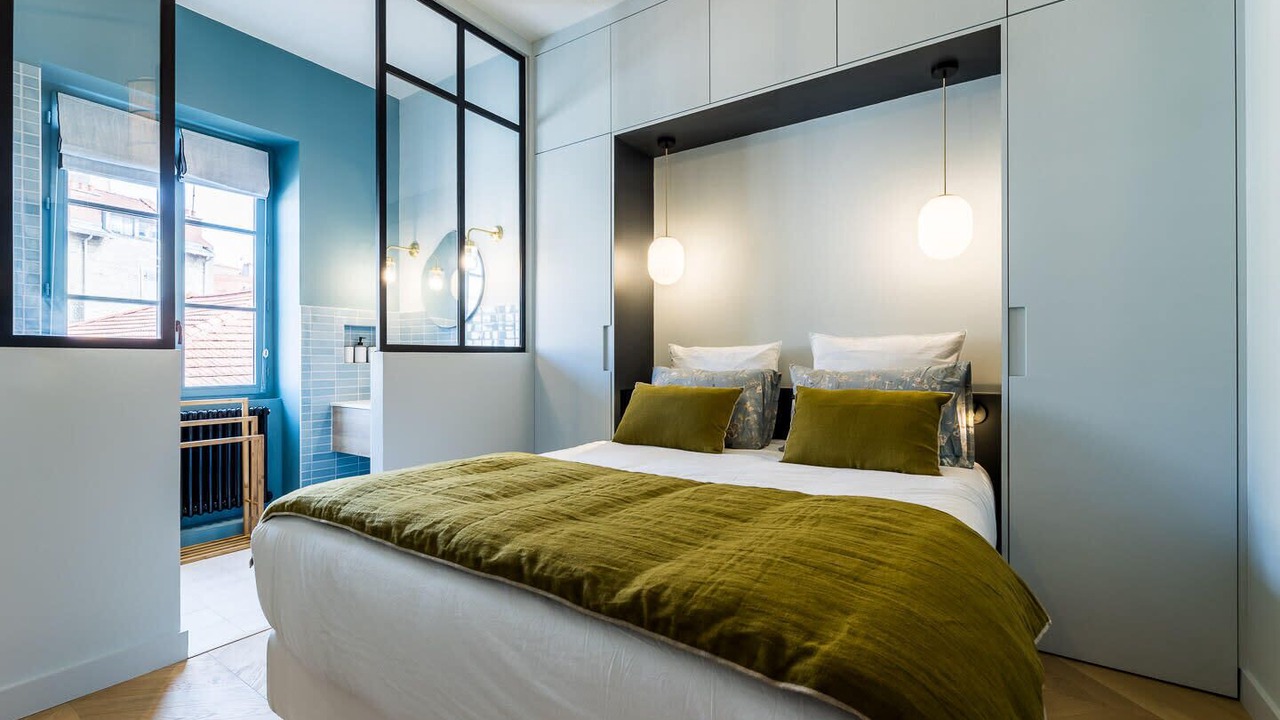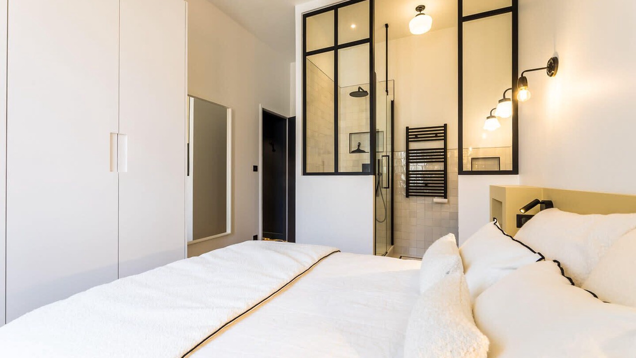 The three suites of the apartment are composed of a sleeping area and an adjoining shower room.