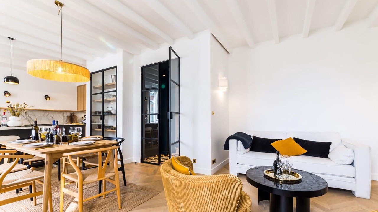 The harmony between the pastel colors, the natural materials used, and the play of light give the apartment a soft and cosy atmosphere; An atmosphere conducive to vacations.