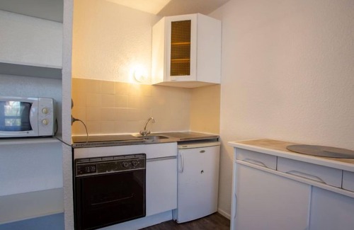1-room studio 20 m2 on 1st floor. Simple furnishings: living/dining room with 1 double sofabed (140 cm, length 190 cm), TV (flat screen). Exit to the balcony. Kitchenette (oven, 3 ceramic glass hob hotplates, toaster, kettle, microwave, electric coffee machine). Shower/WC. Electric heating. Small balcony 5 m2. Balcony furniture. Facilities: washing machine. Internet (WiFi, extra). Please note: apartment street side. Fridge without freezer, no parking. Maximum 1 pet/ dog allowed. TV only FR. Smoke alarm, no lift. 830190005851Z