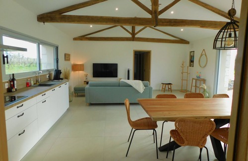 Former wine cellar renovated into a gîte, comprising 3 bedrooms including a master suite with bathroom and WC. The sofa can easily be transformed into a 140cm bed and each room has a 160cm bed with quality bedding. There is also the possibility of adding a travel cot and a high chair for the little ones.