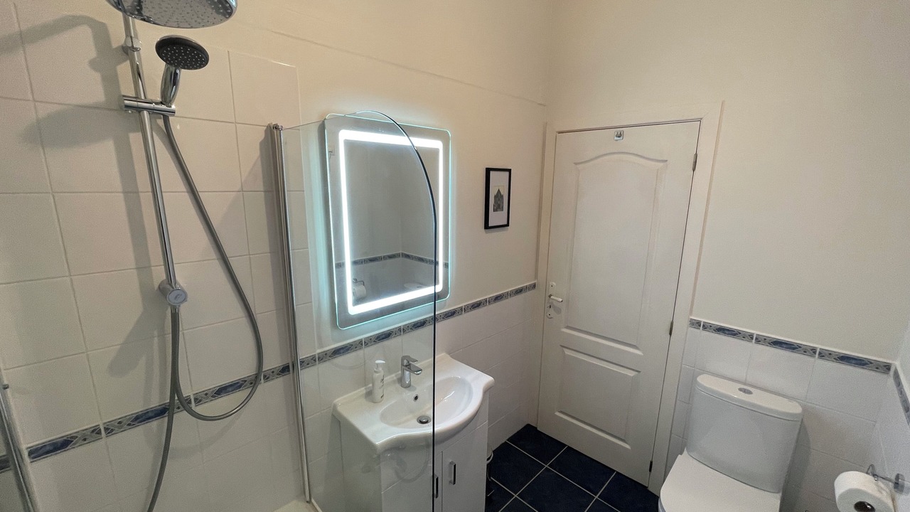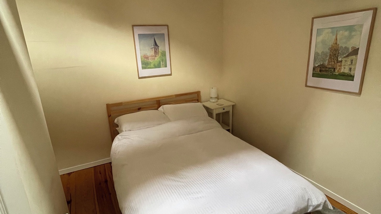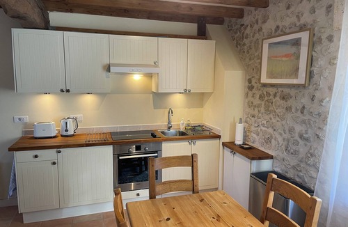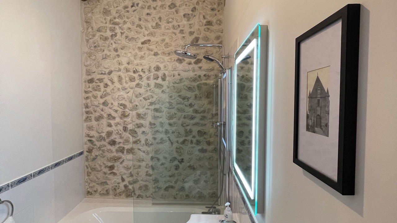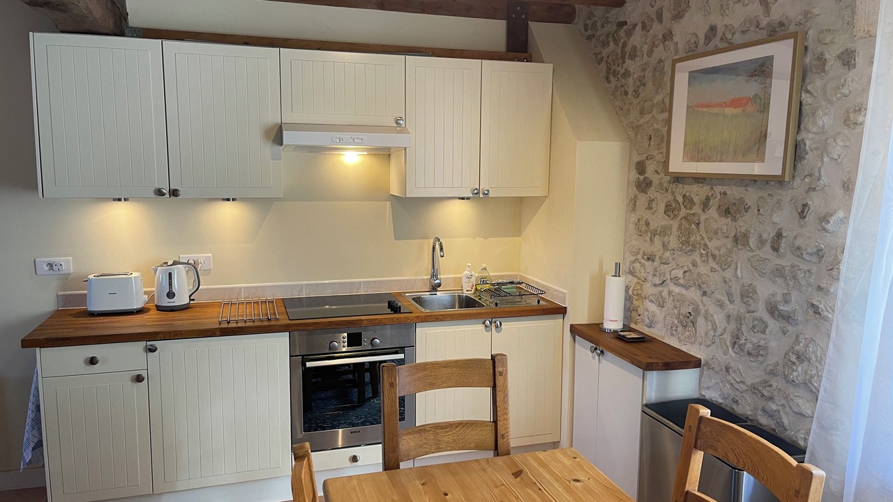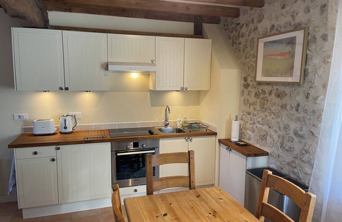 The cozy gîte is accessed from the rear and opens into a welcoming lounge area, with a fully equipped kitchen/dining space beyond. Upstairs, you’ll find two comfortable double bedrooms and a stylish bathroom with a shower over the bath, heated mirror, toilet, and sink.