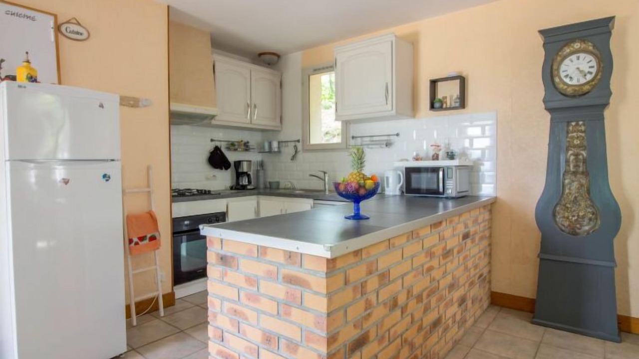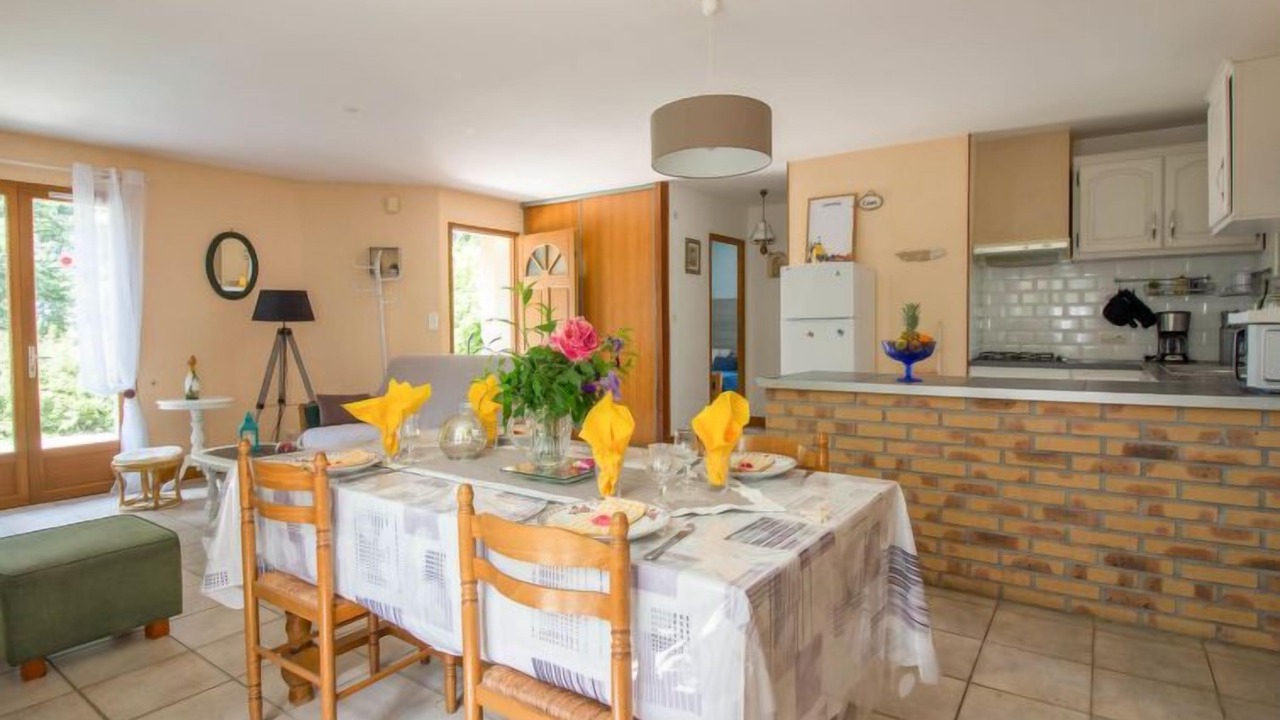 "Chastagnol", 3-room house 60 m2. Practical and beautiful furnishings: living/dining room with open-hearth fireplace (only for decoration), satellite TV (flat screen). Exit to the terrace. 1 room with 1 french bed (140 cm, length 190 cm). 1 room with 2 beds (80 cm, length 190 cm). Open kitchen (oven, dishwasher, 4 gas rings, toaster, kettle, microwave, freezer, electric coffee machine). Shower, sep. WC. Electric heating. Terrace. Terrace furniture, barbecue (portable). Facilities: washing machine, iron, children's high chair, baby cot, hair dryer. Internet (WiFi, free). Please note: non-smoking house. Smoke alarm.