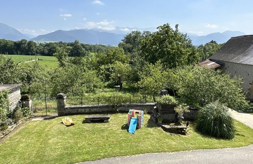 Large renovated Béarnaise house, with outbuildings (barns, press, chicken coop), dating from 1883, completely independent and without neighbors, installed on a height with a breathtaking view of the Pyrenees. Ground floor: Equipped kitchen (fridge-freezer. microwave, induction hob, electric oven, dishwasher). Large friendly living room, lounge (TV sofas), storage room (washing machine), shower room (Italian shower) / toilet. Upstairs: 5 bedrooms (3 double beds, 4 single beds), shower room (Italian shower). 2 toilets. Electric heating in supplement on meter readings Unfenced land with a landscaped and flowery garden. Shaded terrace with dining area (barbecue) and garden furniture, 4 sun loungers. Ping-pong table and table football. Many games for young and old. Possibility to visit the owners' farm located 500m from the cottage. Accessible on foot from the cottage: walk on a tarred path through the forest to the Béez river. No internet connection, nor possibility of WIFI connection. 3G/4G connection possible (provided that your mobile operator covers the area of the cottage). Sheets can be rented.