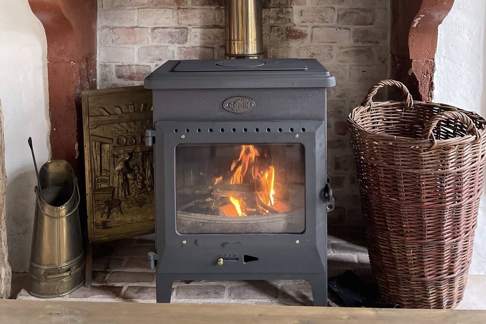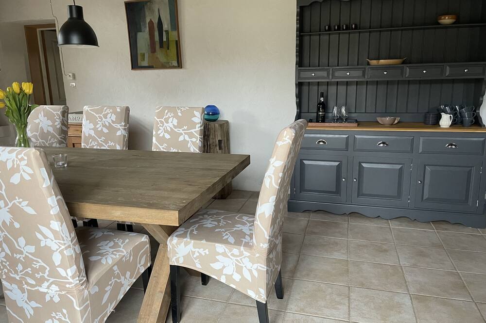 Dining kitchen- large dining table and chairs, wood burning stove, fridge, electric cooker/oven, microwave, nespresso coffee machine, kettle, toaster and dishwasher. The kitchen is well equipped for cooking and dining.