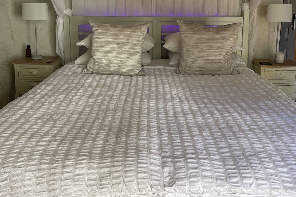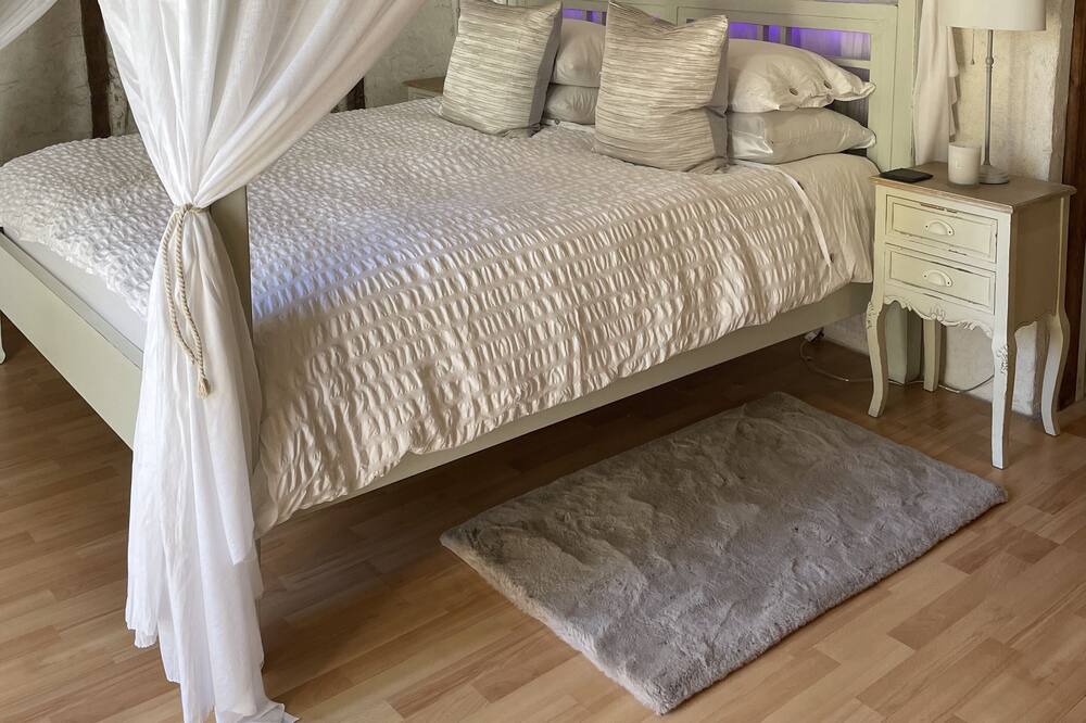 The Master bedroom has feature beams and a super king sized bed and an ensuite comprising of 2 sinks, bath with shower over, a separate shower and toilet. The second bedroom has feature beams, super kingsized bed and cot along with large rustic wardrobe. The third bedroom has a kingsized bed and a single day bed.