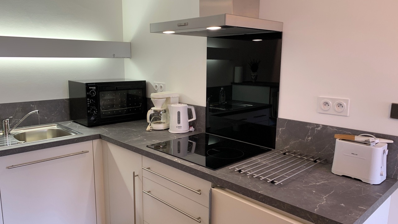 • Fully equipped open kitchen with dishes, 3-zone induction cooktop with fan, refrigerator, countertop electric oven, microwave oven, electric kettle, toaster, and filter coffee machine
