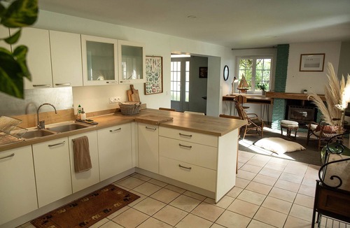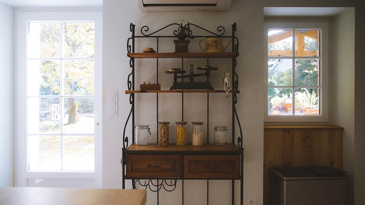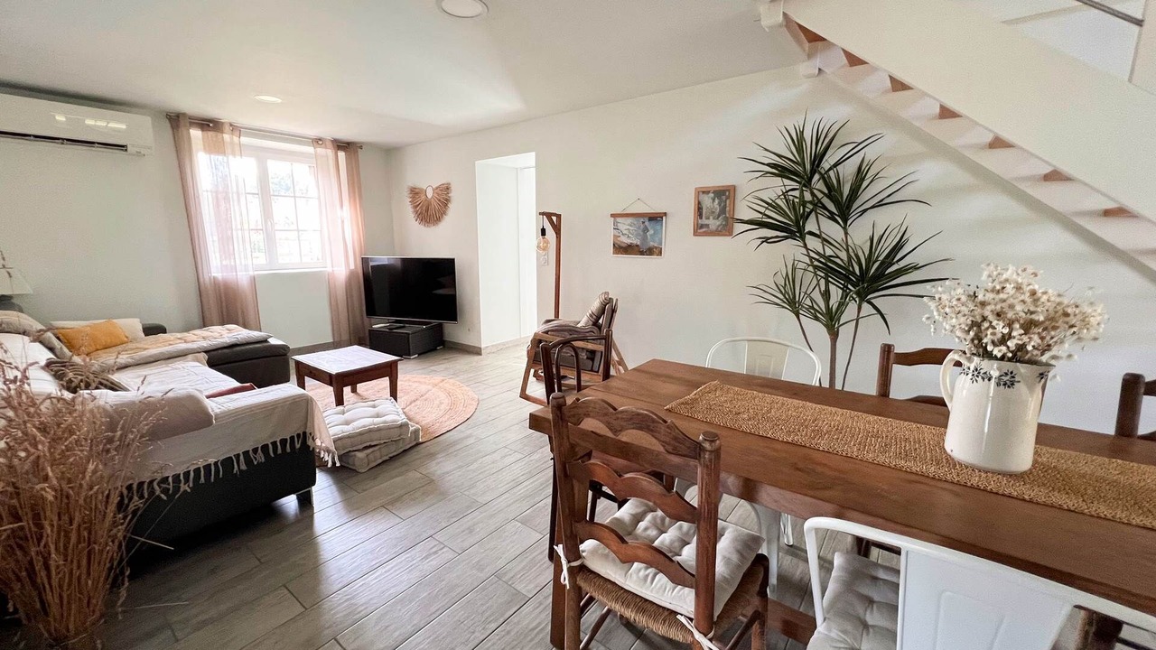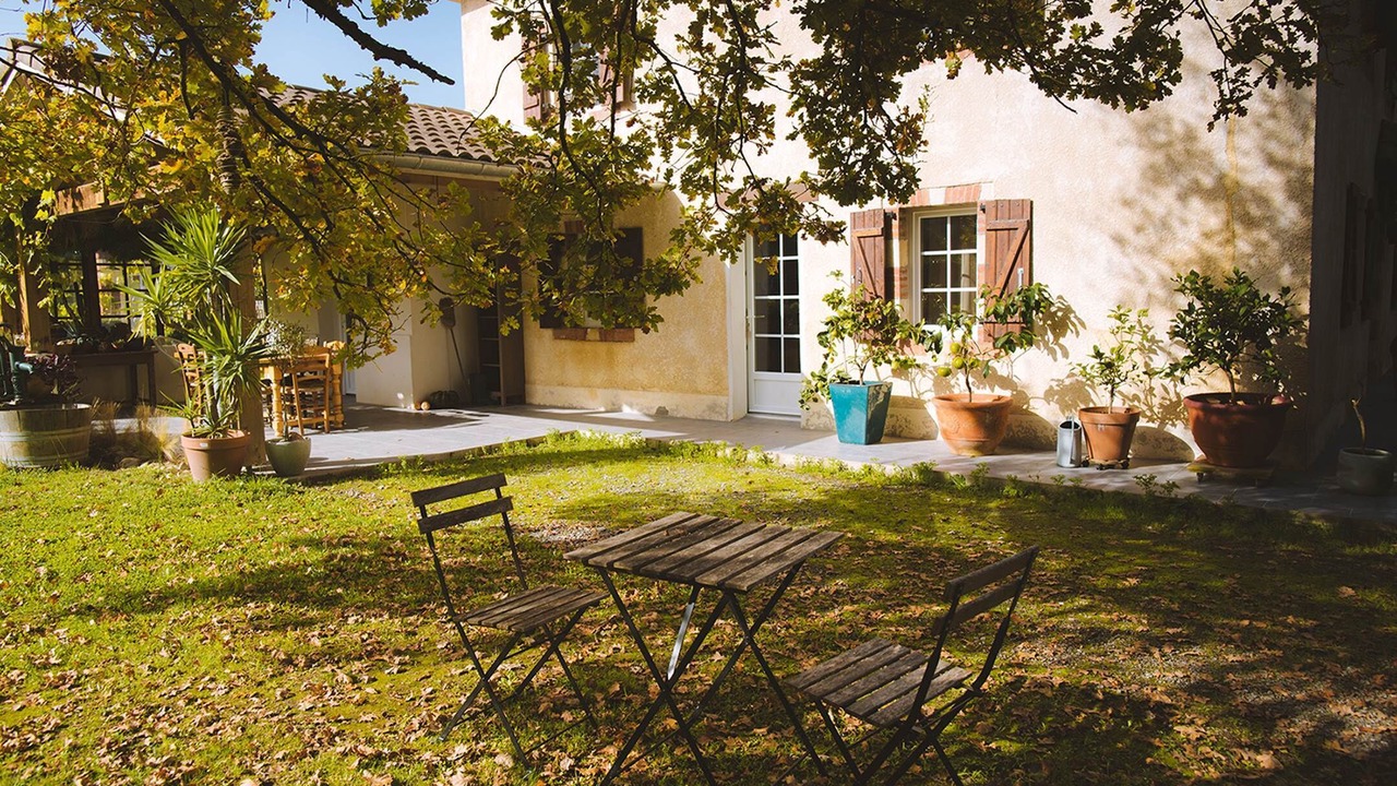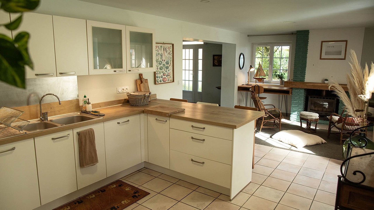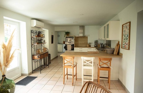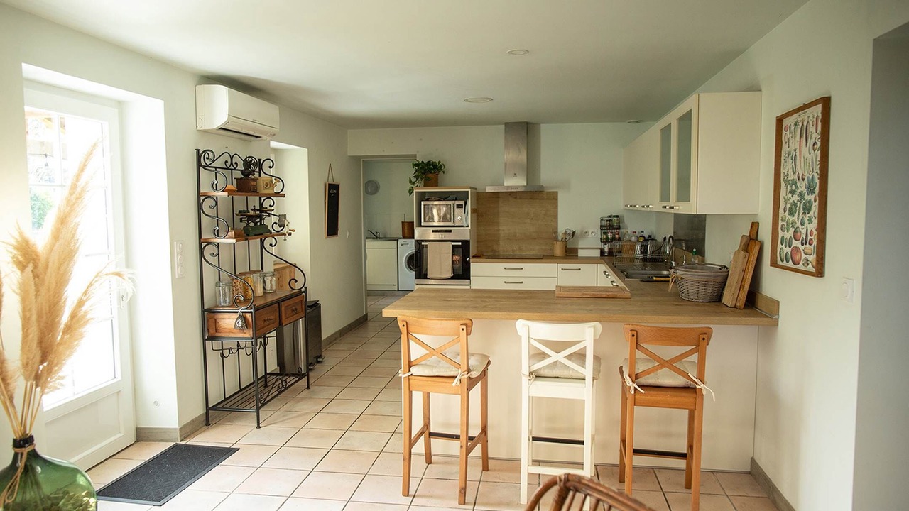 The others are bedrooms with 160 cm beds. We have a large living room with a fully equipped kitchen opening onto a beautiful old terrace with its well and climbing vine. Being an old house, it is naturally cool in summer and heats up quickly in winter thanks to the wood stove. For the hot summers it is equipped with an air conditioning system. In the evening, you can go to the vegetable garden behind the house or the wooden tavern, or simply go and collect eggs in the chicken coop.