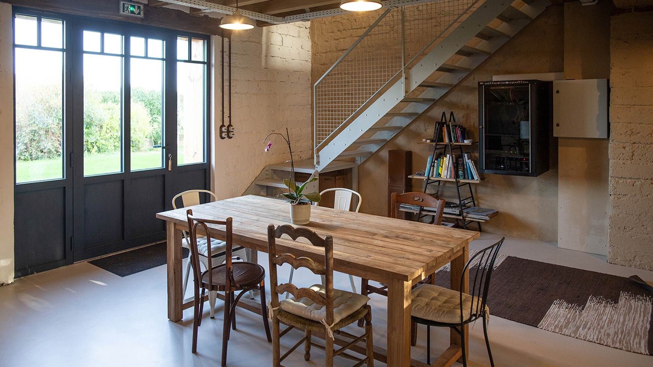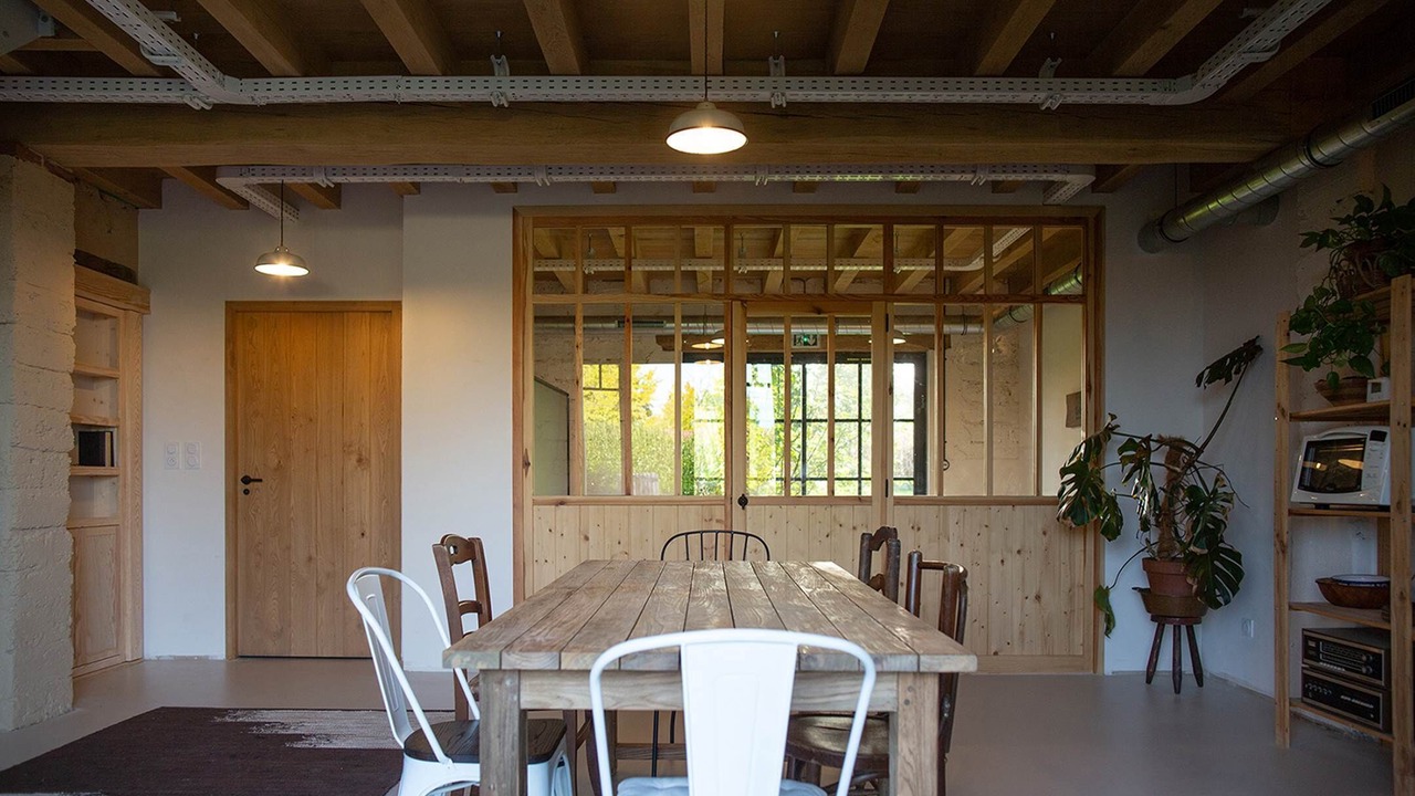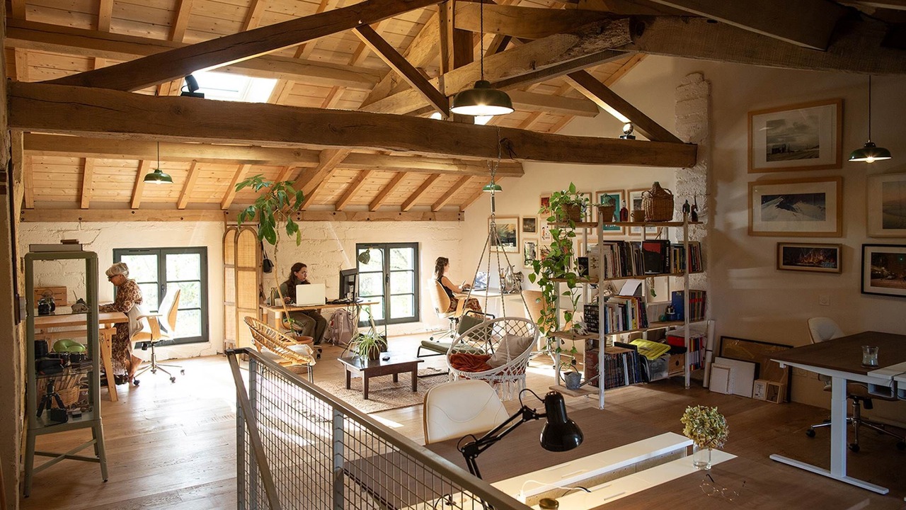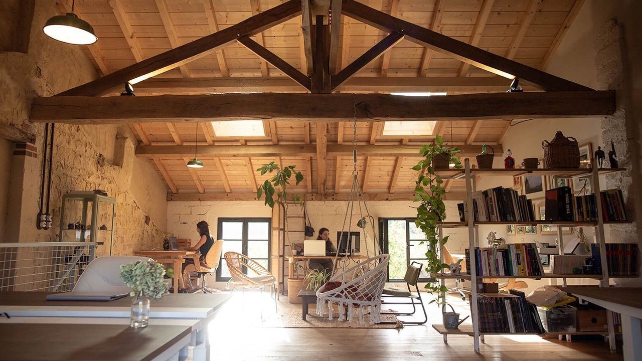 This 100 square meter old barn has been completely renovated since 2021 and converted into a beautiful workspace and can accommodate up to 10 artists. The ground floor has a private and soundproof meeting room, toilets that meet disabled access standards, a dining room and a fully equipped kitchen. Coffee and tea are provided and we sell local products on site such as apple juice that we produce on the farm. The barn is equipped with fiber and outdoor wifi if you want to work outside and enjoy the sunny days. The space mixes old and modern materials and has been designed to make you feel at home. The construction of the studio also uses natural and ecological materials such as clay, lime and wood. The building has been designed to minimize energy losses, so that even in winter you can enjoy underfloor heating and work in pleasant conditions. The best thing is to open the windows during spring or summer and enjoy the birds singing, the squirrels passing by or the sound of the rain while you work! End your working day with a break in the chicken coop or pick strawberries in the garden during the summer.