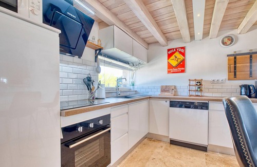 Spend your holidays in this holiday home, which offers ideal conditions for relaxing hours with its lovingly designed outdoor area. The house exudes a cosy atmosphere with its natural materials and warm colours. Cook together in the open-plan kitchen and start the day with a delicious breakfast at the kitchen counter. In the attractively designed living area with a view of the garden, comfortable seating and exposed wooden beams create a cosy atmosphere.