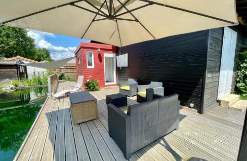 Offering a garden, Maison du sentier du littoral features accommodations in Gujan-Mestras. This beachfront property offers access to a terrace and free Wifi. The vacation home offers parking on-site, an outdoor swimming pool, and a concierge service. The vacation home consists of 4 bedrooms, a living room, a fully equipped kitchen with a dishwasher and a coffee machine, and 2 bathrooms with a bath and a hair dryer. Towels and bed linen are offered in the vacation home. The property has an outdoor dining area. La Hume Beach is a 11-minute walk from the vacation home, while Kid Parc is 2 miles from the property. Bordeaux–Mérignac Airport is 34 miles away.