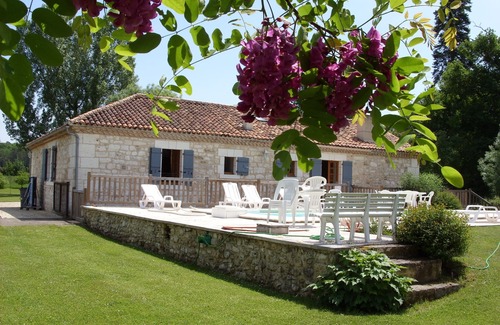 In a green, bordered by the river 'The Cole' castle ruins Bruzac overhang. Large living room with fireplace, 3 bedrooms, 1 suite with bathroom and toilet (2 beds 140, 1 with 2 beds 90), 1 independent WC, 1 mezzanine with BZ (140).