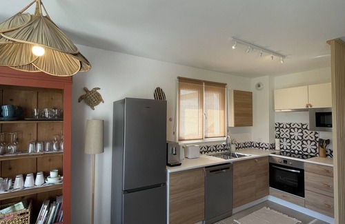 A living room equipped with a sofa and two armchairs, a television, an internet connection, a library, a dining room with a large table and a dresser, an open kitchen with washing machine. crockery, fridge-freezer, oven, microwave, induction hob, hood, toaster, kettle, coffee maker, Nespresso...