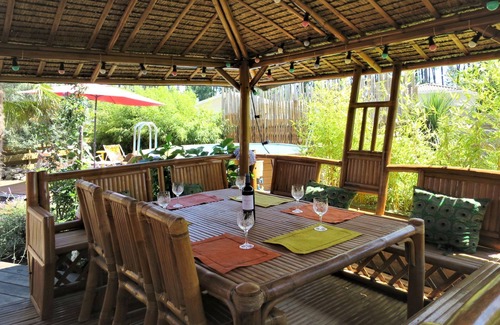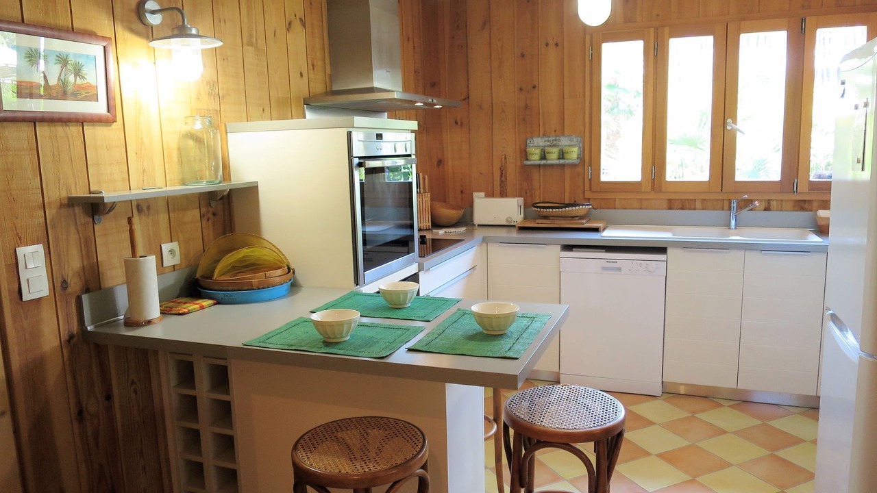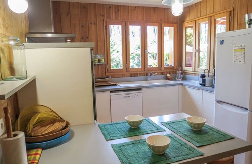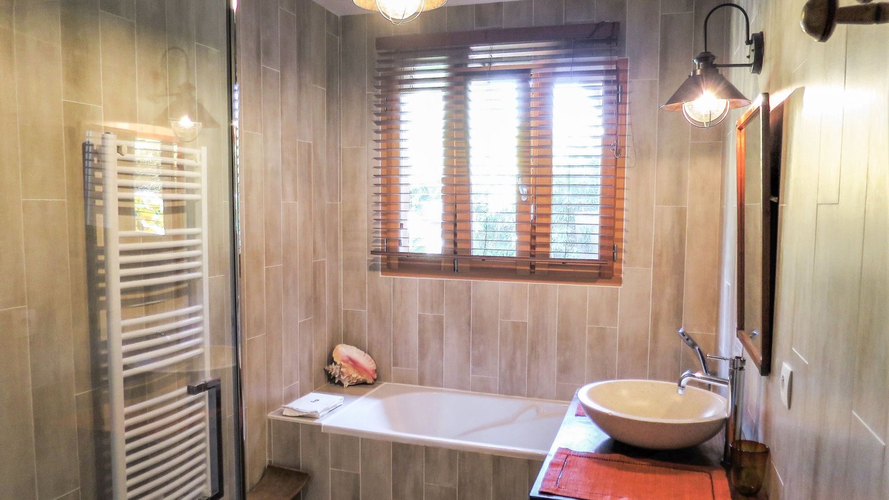 "Ti Kaz Doudou", 4-room house 100 m2. Cosy and wooden furniture furnishings: living/dining room with dining table and TV (flat screen), air conditioning. Exit to the terrace. 1 room with 1 french bed (140 cm, length 190 cm). 1 room with 1 french bed (160 cm, length 200 cm). 1 room with 1 french bed (160 cm, length 200 cm), TV (flat screen). Open kitchen (oven, dishwasher, 2 ceramic glass hob hotplates, 2 gas rings, toaster, kettle, microwave, freezer, electric coffee machine). Bath/shower, sep. WC. Electric heating. Large terrace 160 m2 partly roofed terrace 30 m2. Terrace furniture, barbecue (portable), deck chairs (6). Facilities: washing machine, dryer, iron. Internet (WiFi, free). Please note: non-smoking house. Smoke alarm. Offer by a private individual according to Art. 155, IV of CGI.