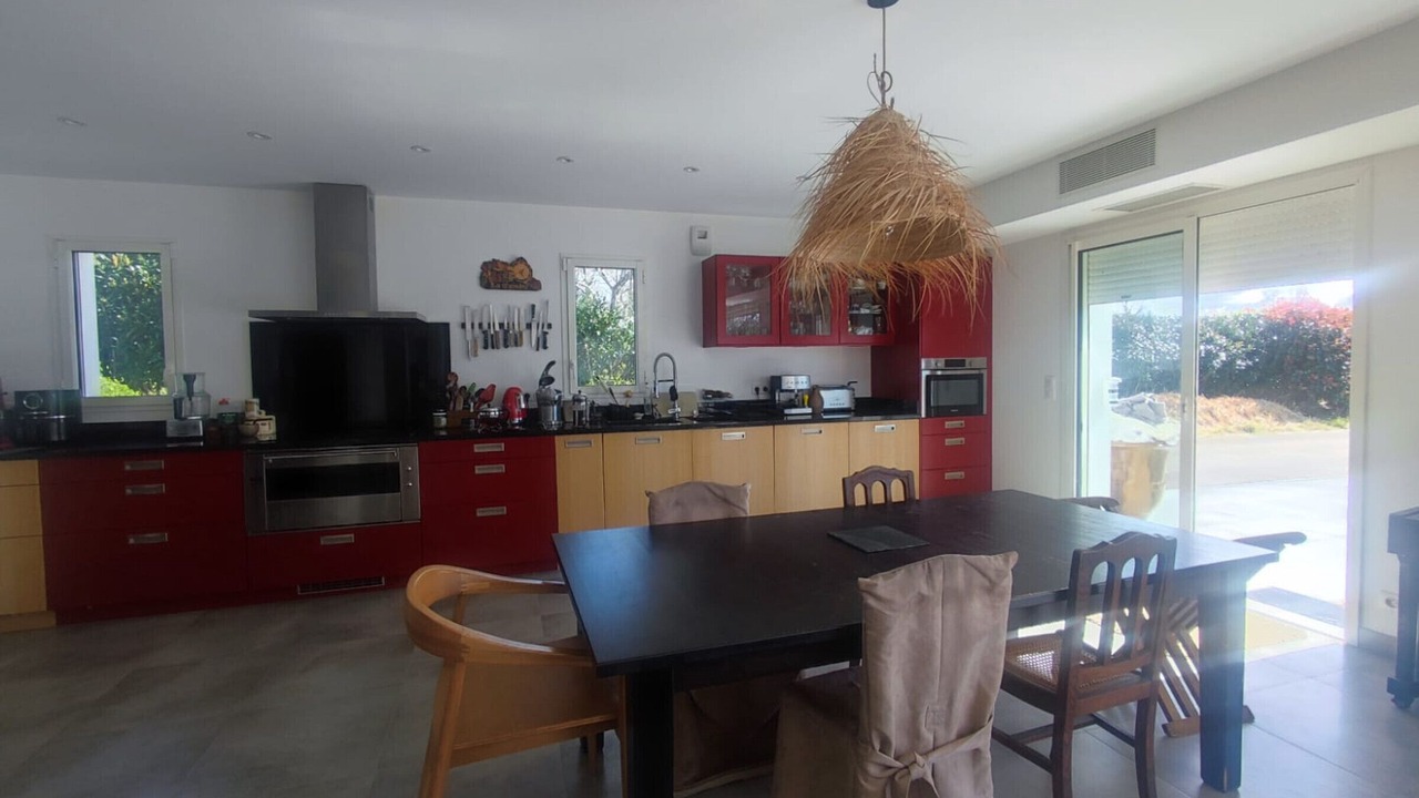 Continuing your exploration, you will enter the main living room, where a generous lounge area invites you to relax. A superb dining table sits in the center of the room, while a fully equipped kitchen, open to the living room, will allow you to prepare delicious meals in a friendly atmosphere. This vast living room opens gracefully onto the swimming pool, offering a breathtaking view of the Rhune, creating an atmosphere of serenity and well-being. To the left of the kitchen, a practical laundry room adds a touch of functionality to this harmonious space.