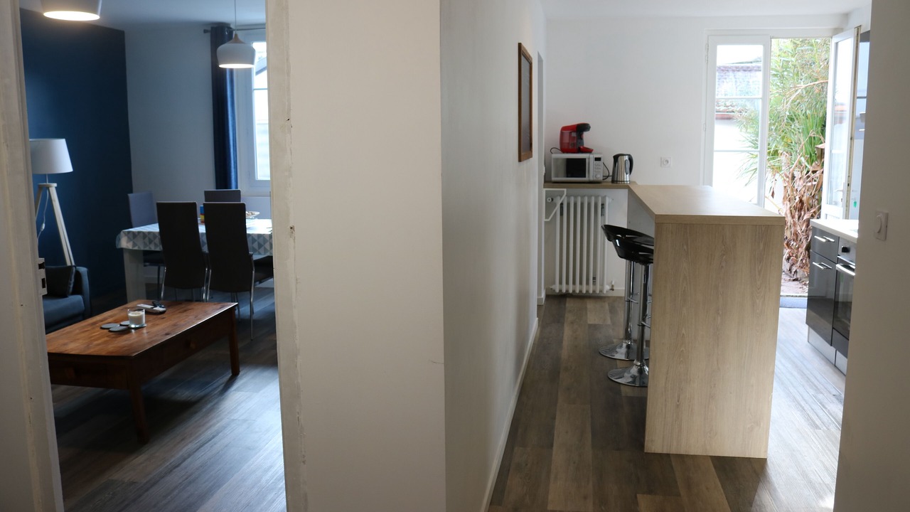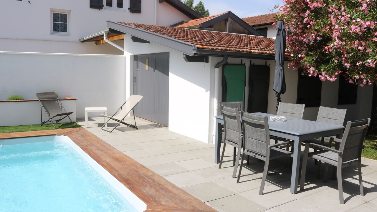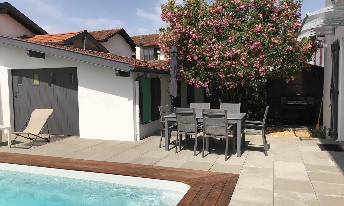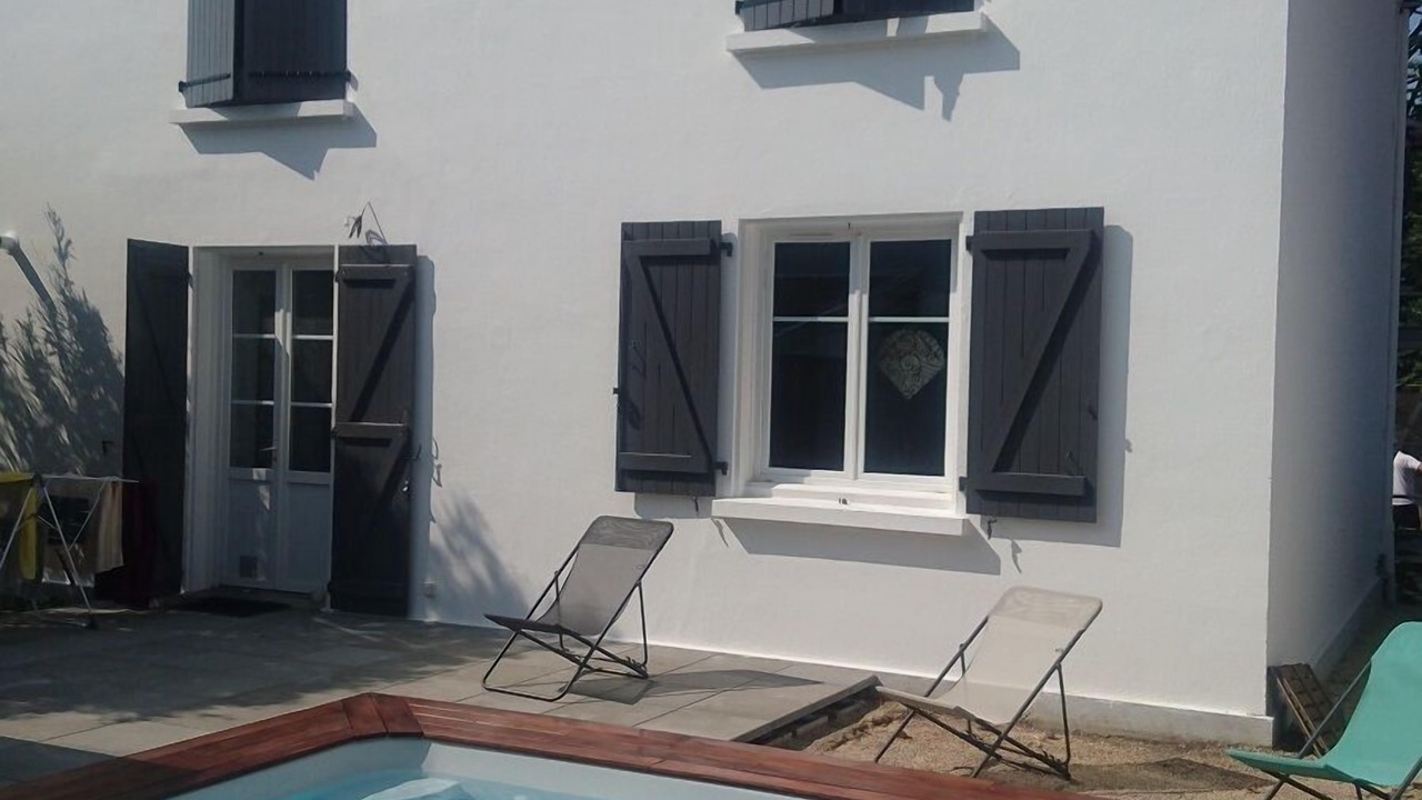 1930's town house of 130m², fully renovated with garden and private pool. On the ground floor, living room with a large screen TV, a kitchen and a pantry, a bedroom with bathroom. On the floor 3 rooms with their own bathroom. WIFI and Internet provided. The garden has a terrace with table and chair, as well as sun baths. The property is fenced, closed by a gate.