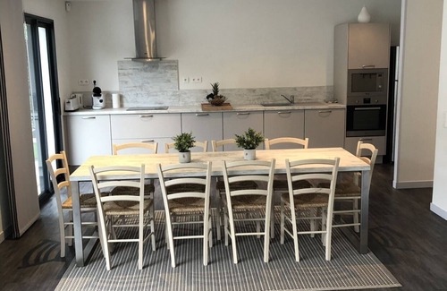 MODERN HOUSE LARGE LIVING ROOM DINING ROOM FULLY EQUIPPED TWO BEDROOMS WITH LARGE BEDS, TWO BEDROOMS WITH TWO 90X190 BEDS, 2 BATHROOMS, 2 TOILETS, ANOTHER FURNISHED AND CLOSED EXTERIOR SHOWER BARBECUE LAND OF LARGE AREA CONVENIENCE SHOPS NEAR THE OCEAN OF THE GREAT LAKES CYCLING TRACKS, YOU ARE IN A VERY QUIET AREA THE FOREST IS AT YOUR DOOR